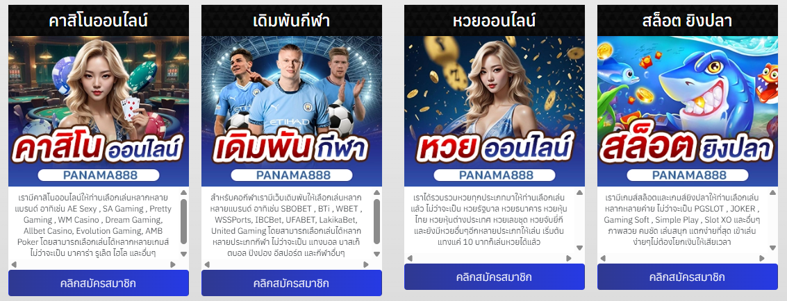 คาสิโนออนไลน์ สล็อตออนไลน์ เกมส์ยิงปลา เดิมพันกีฬา ครบวงจรที่นี่ที่เดียว เราคือเว็บพนันออนไลน์อันดับ 1 ของเอเซีย ด้วยระบบฝากถอนที่รวดเร็ว ปลอดภัย มั่นคง ทำให้ลูกค้าสามารถเล่นเดิมพันออนไลน์ได้อย่างต่อเนื่องตลอด 24 ชั่วโมง ให้ความรู้สึกเสมือนไปนั่งเล่นอยู่ที่คาสิโนต่างประเทศอย่างแน่นอน Panama888 เรามีเกมส์เดิมพันหลากหลายให้เลือกเล่นครบทุกประเภท ไม่ว่าจะเป็น บาคาร่า รูเล็ต ไฮโล แทงบอล บาส ปิงปอง อีสปอร์ต สล็อต ยิงปลา ป๊อกเด้ง ปั่นแปะ น้ำเต้าปูปลา และเกมส์อื่นๆอีกมากมายที่มีให้เลือกเข้าไปเล่นโดยไม่ต้องมีการโยกย้ายกระเป๋าเงินอีกต่อไป ยังไม่หมดเพียงเท่านี้เรายังมีโปรโมชั่นและกิจกรรมพิเศษให้ร่วมอยู่ตลอด ไม่ว่าจะเป็น เปิดไพ่เสี่ยงโชค กงล้อลุ้นทอง โบนัสวันเกิด โบนัสเติมเงิน Panama888 เรายินดีให้บริการลูกค้าทุกท่านด้วยความใส่ใจจริง พร้อมให้ความช่วยเหลือตลอด 24 ชั่วโมง